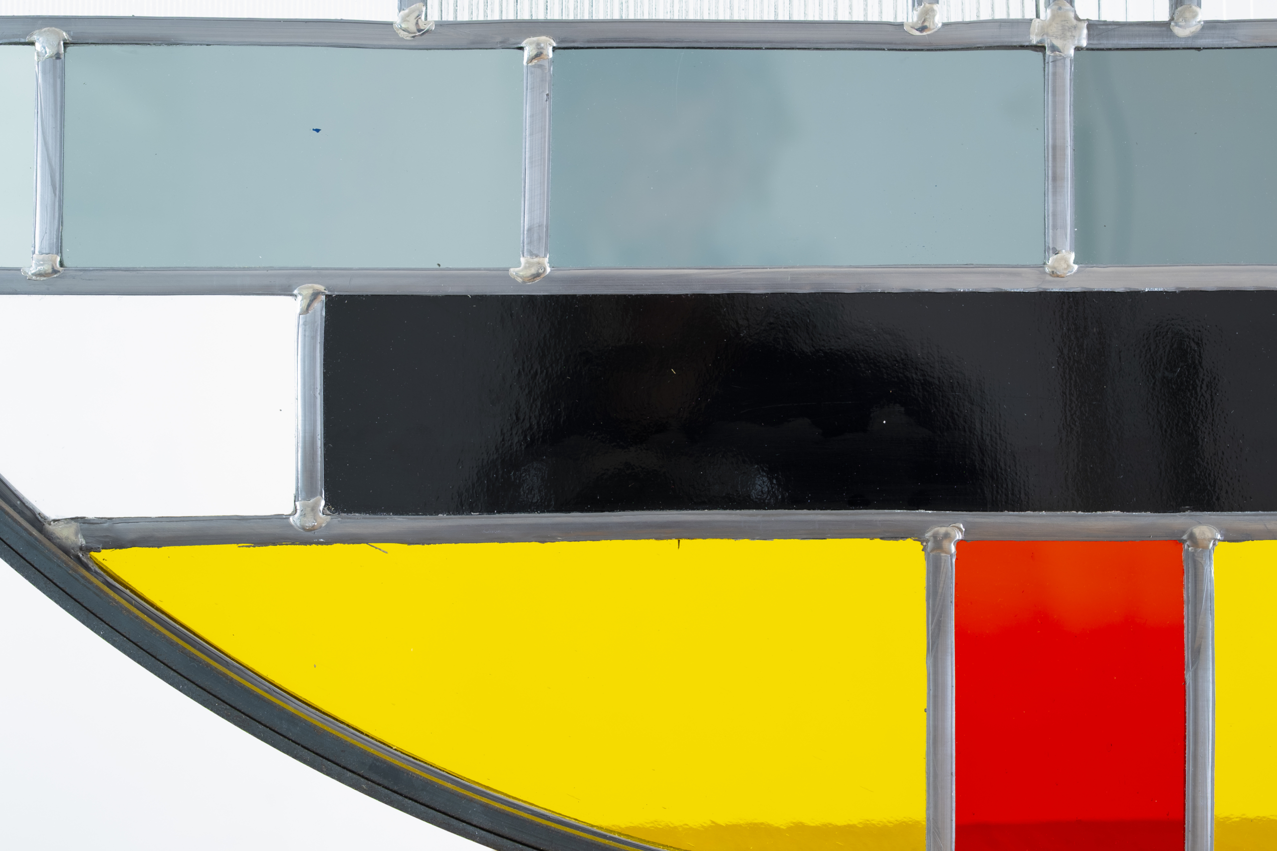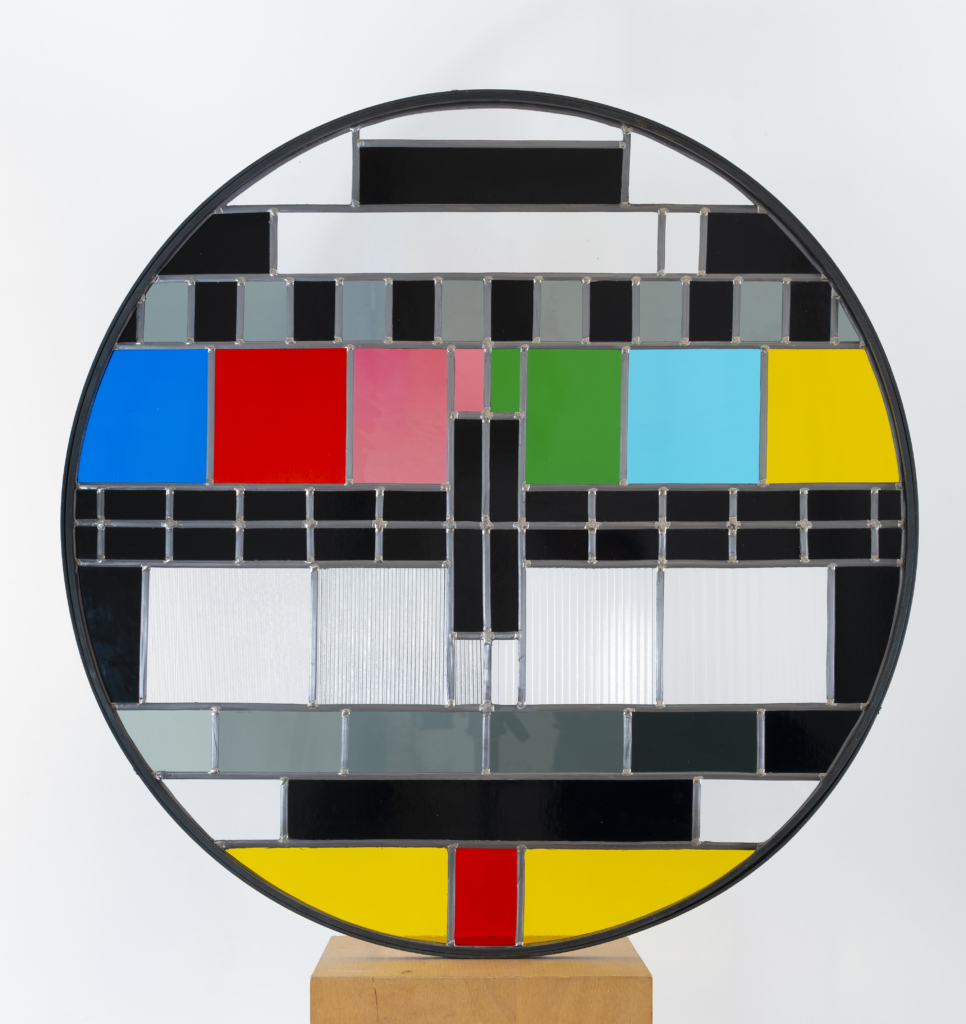 En fixant ce motif technique et profane dans le médium ancestral du vitrail, l’artiste établit un pont entre l’omniprésence des écrans et la quête ancienne de contemplation. Entre le flux et la permanence, entre l’invisible transitoire et ce qui demeure.