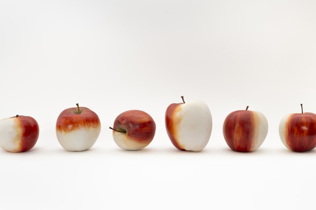 Cette série de sculptures en stuc, partiellement peintes en maquillage en trompe-l’œil, ne cherchent pas à dissimuler mais montrent au contraire le geste même de la transformation. Avec ‘Mon beau miroir, dis-moi’, Rémi Amiot propose une réflexion sur les mécanismes de représentation et d’idéalisation qui façonnent nos sociétés contemporaines. En questionnant les normes visuelles qui nous traversent et nous modèlent, l’œuvre devient la métaphore d’une injonction esthétique omniprésente. En révélant la tension entre authenticité et artifice, identité et performance, réel et simulacre, l’artiste met en lumière une condition contemporaine : une vanité nouvelle, où l’idéalisation finit par se confondre avec l’effacement.