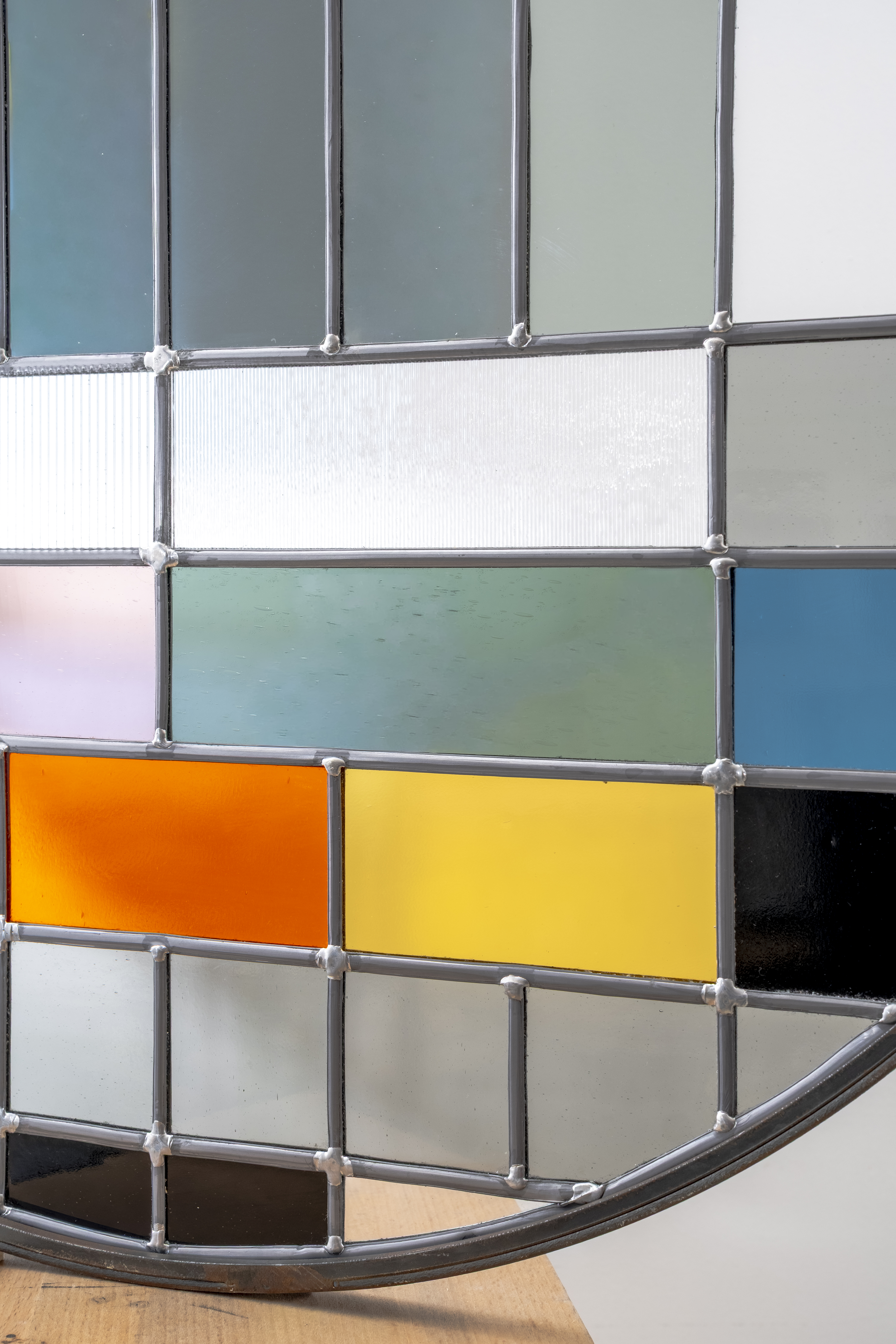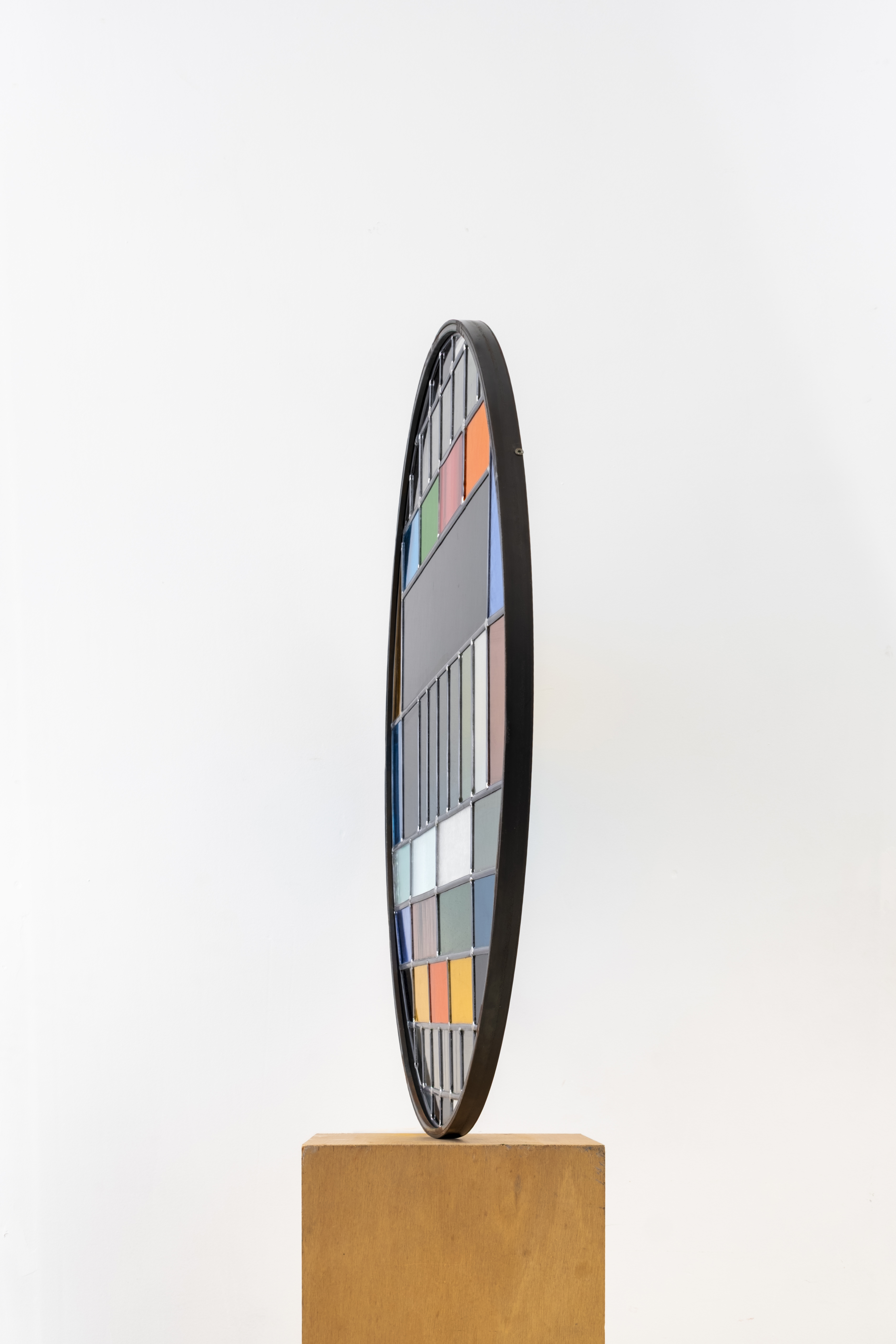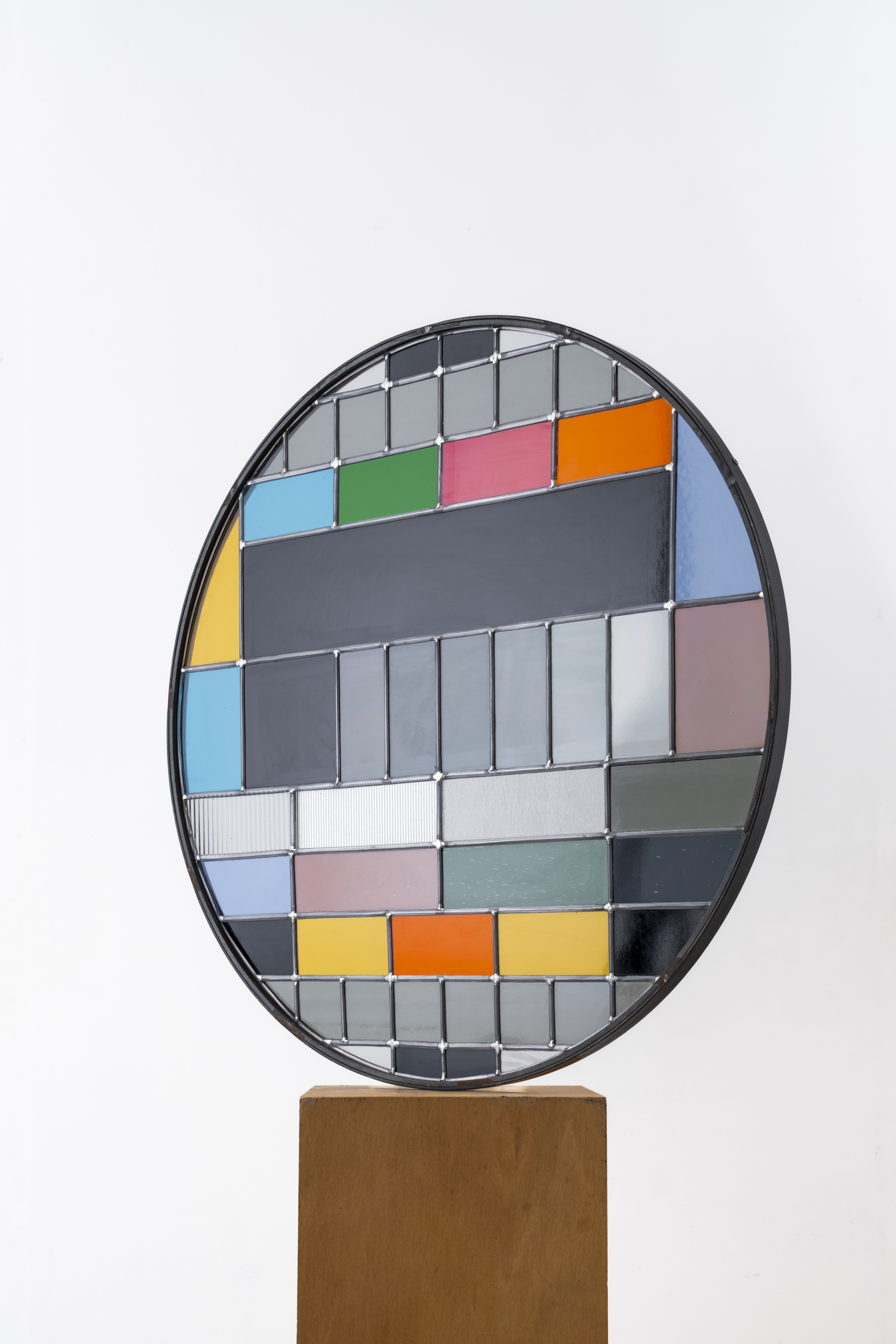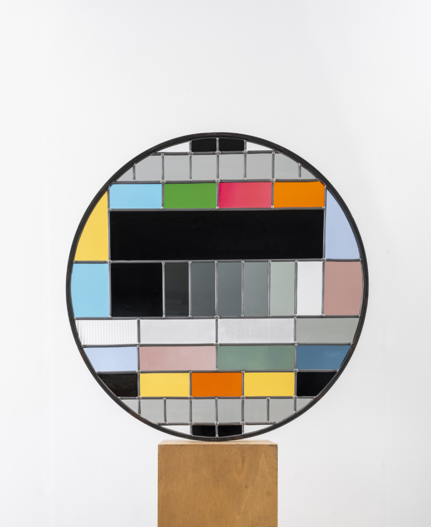 Au milieu du XXe siècle, l’essor de la télévision fait apparaître la mire d’étalonnage : instrument d’ajustement et de normalisation. D’ordinaire tenue hors-champ, ce dispositif technique est ici transposé en plomb et en verre, pérennisant un motif voué à n’exister que par intermittence.